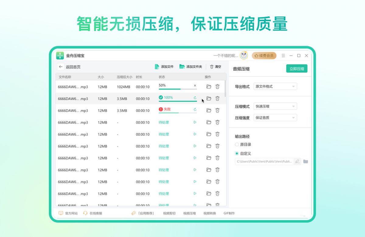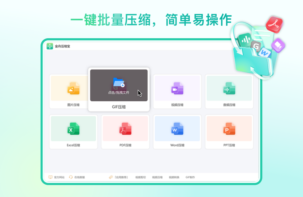 金舟压缩宝一款文件压缩集合软件,集合了视频压缩,GIF压缩,音频压缩,图片压缩,PDF压缩,Word压缩,PPT压缩,Excel压缩;界面简单,功能稳定,支持批量压缩,操作起来非常方便;文件压缩都是在本地完成的,无须上传,能够有效的保证文档安全性;给需要文件压缩的用户带来福音。