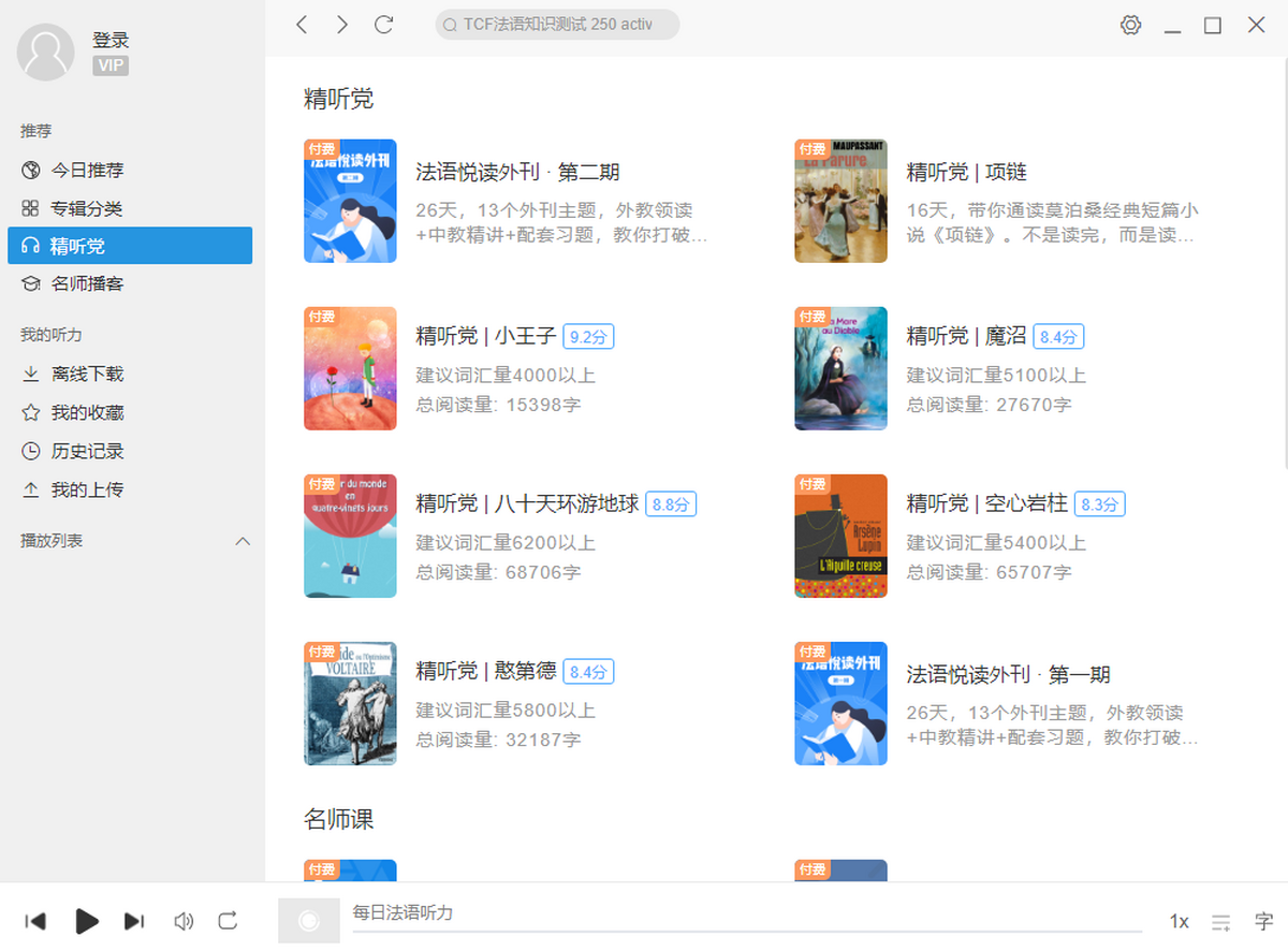 每日法语听力免费版是一款学习法语必备的听力工具,软件每天更新的海量听力库,每周由专人为您编辑的法语听力阅读训,收入海量日常会话训练、名人演讲资源,独家支持语音高亮跟随功能。