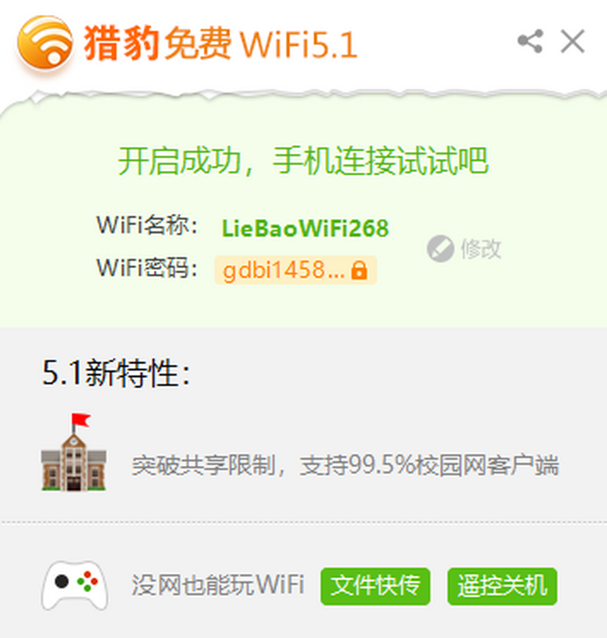 猎豹免费WiFi电脑版是一款免费、极简的无线路由器,用户只需下载并运行它,就能将电脑瞬间变成免费WiFi,从而让手机、PAD等无线设备免费上网。