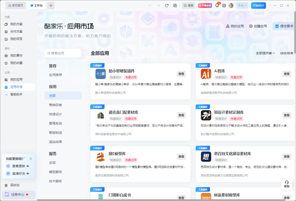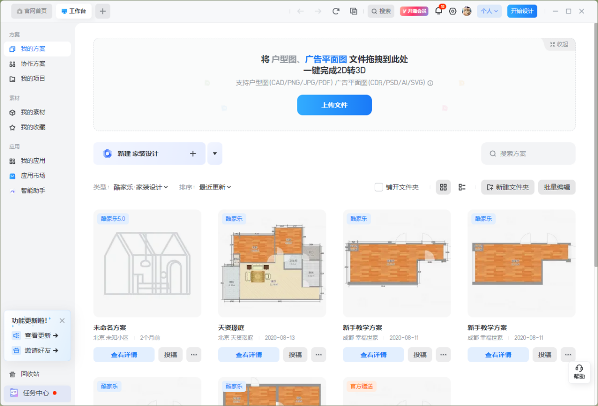 酷家乐室内装修设计致力于为全球设计师提供更简单高效的智能化3D云设计,可帮助设计师快速产出:无需PS的高级平面彩图、炫酷的3D全景图、照片级渲染效果图、一键生成施工图/材料清单。酷家乐,10秒出高清效果图,5分钟产出装修设计方案。覆盖全国100个城市,100万标准户型图,不用设计就能轻松获得你想要的户型!支持模型上传,CAD导入导出。真正所想即所得,还支持产出全景俯视图,更有720度全景浏览,亲临现场体验设计方案的感觉。
